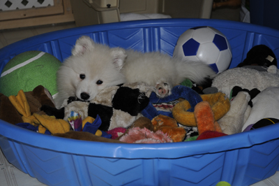 What every puppy needs is and endless supply of toys. It didn't take Tala long to find our toy pool filled with all sorts of toys. While she like to climb in and play (and chew) on all the toys, we have even found her napping with all the toys. I think that may be called 'too much fun'. |
